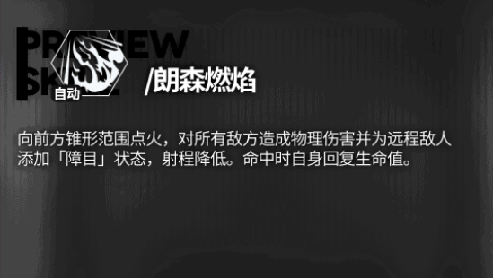 向前方锥形范围点火,对所有地方造成物理伤害,并且远程敌人添加障目效果。