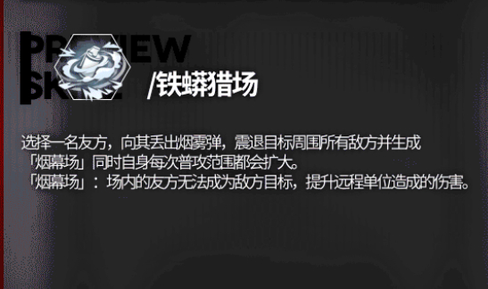 烟幕场:场内的友军无法成为敌方目标,提升远程单位造成的伤害。