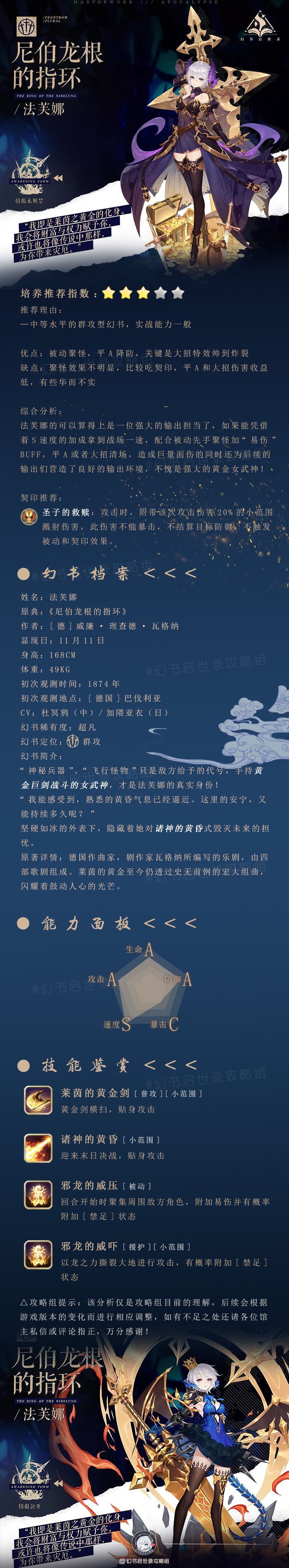 幻书启示录中尼伯龙根的指环法芙娜是一个大招帅到炸裂的幻书,幻书启世录尼伯龙根的指环怎么样?下面小编给大家介绍幻书启世录尼伯龙根的指环技能强度攻略,一起看吧。