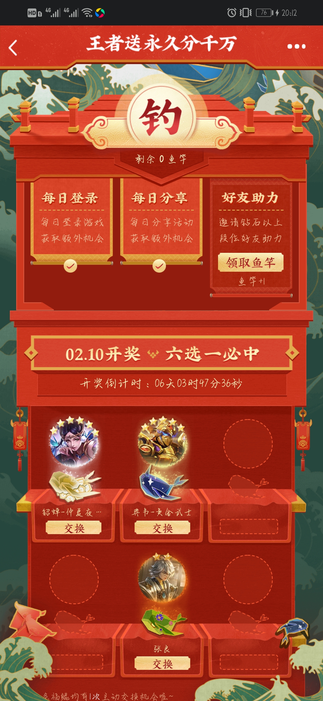 每日登陆,分享链接给好友,邀请好友助力,每个鲲都代表一个皮肤,集齐六个,即可开奖,进行皮肤六选一。