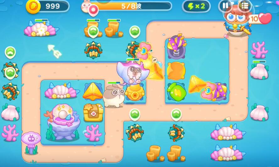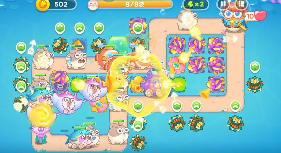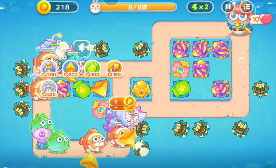 7、右下角建造箭塔清理障碍物和对残血的兔子补刀,右上角建造烟花对兔子进行输出。