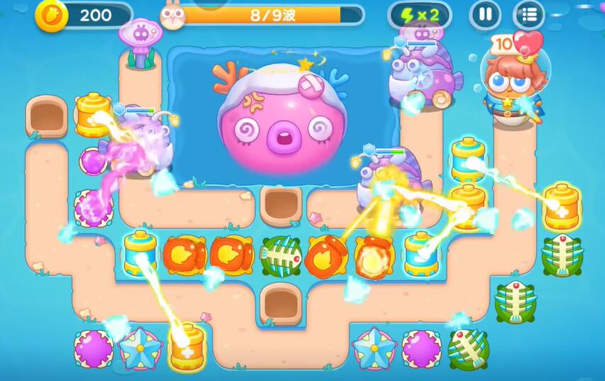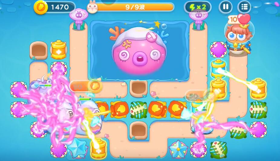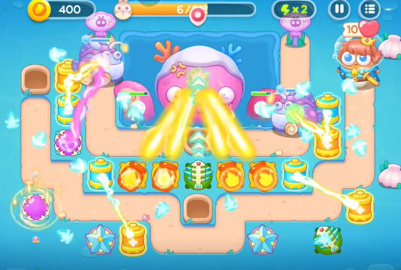 5、在中央建造一个鱼骨,右下角建造一个减速塔对兔子小怪进行攻击。