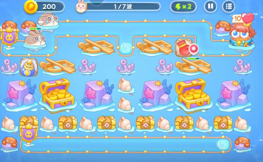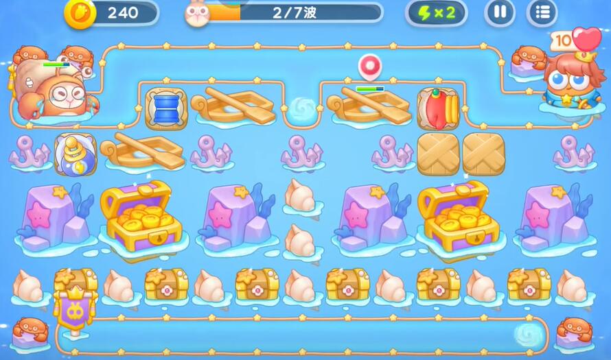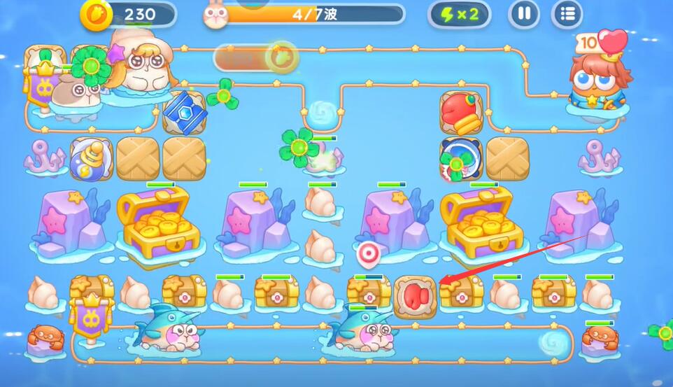 5、通过摧毁宝箱可以获得蝴蝶结和章鱼,利用这两个塔对障碍物进行输出。