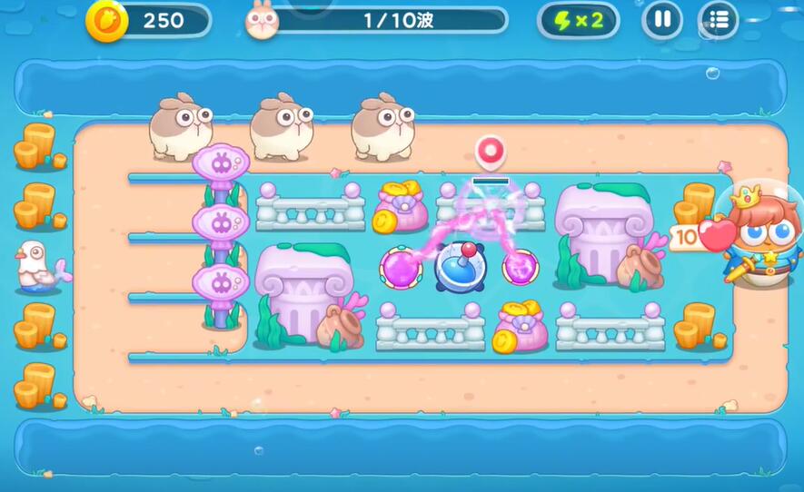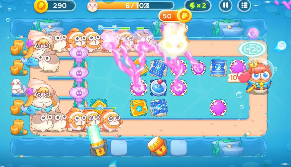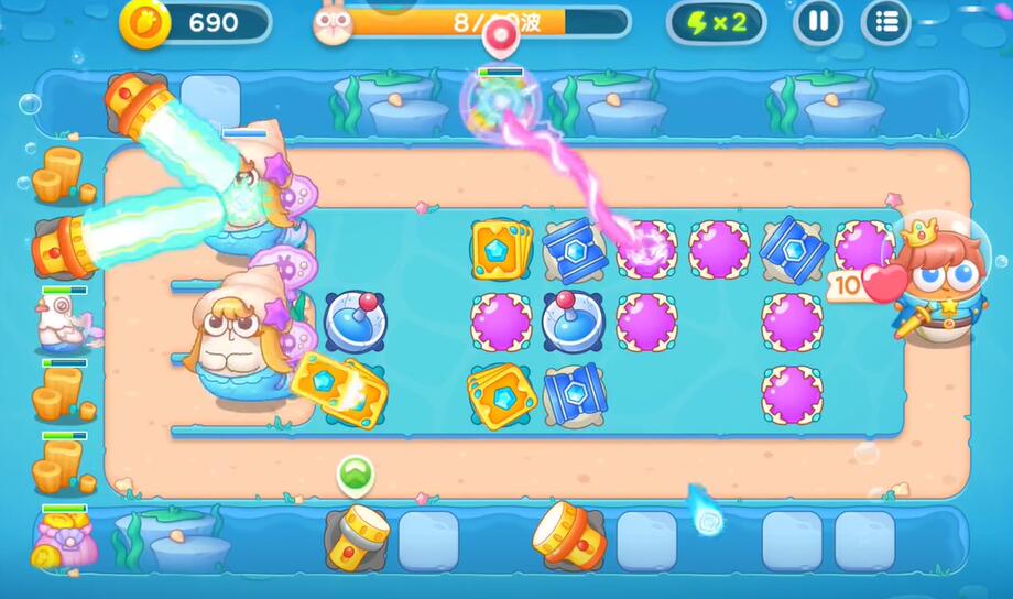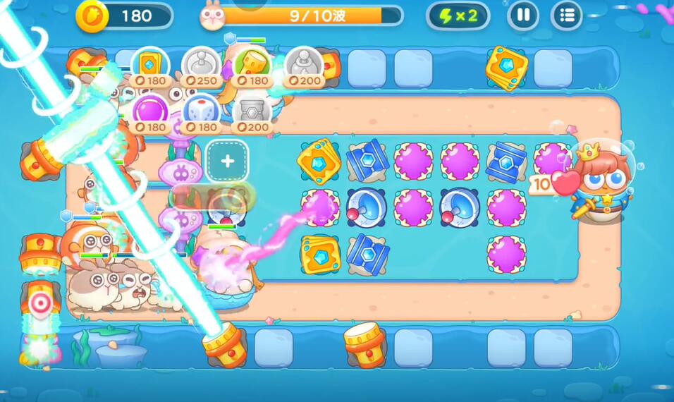 5、在中间的最上方的一排建造魔法球和双向塔对兔子进行输出,下方建造手电筒清理水中的障碍物和兔子。