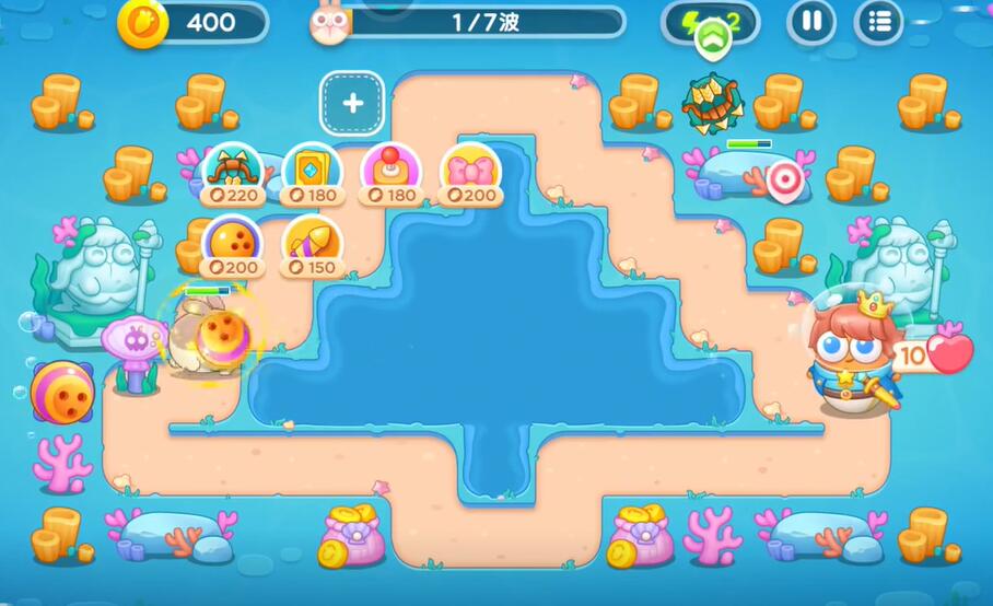 7、在中间补充防御塔,右下角补充多重箭对兔子进行攻击。