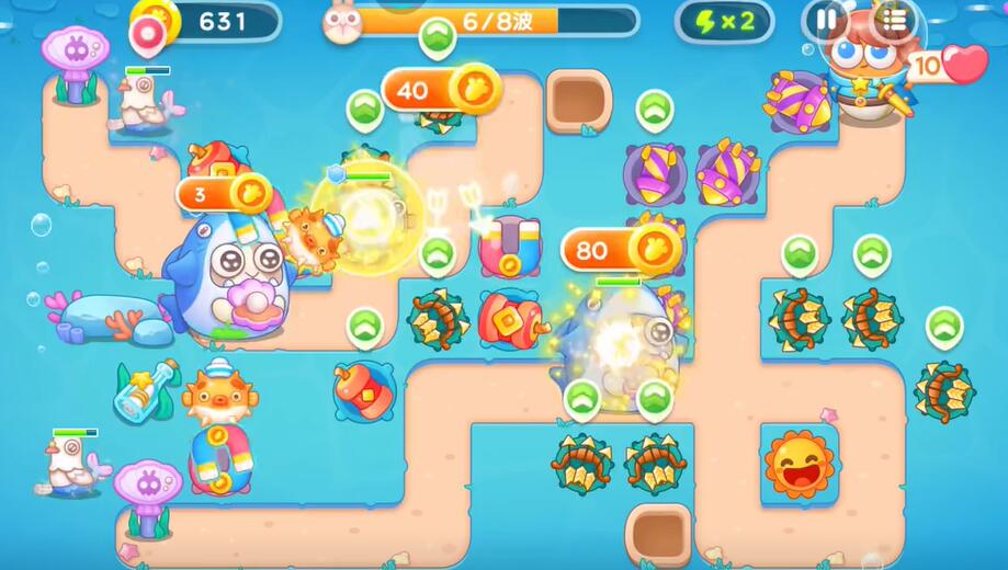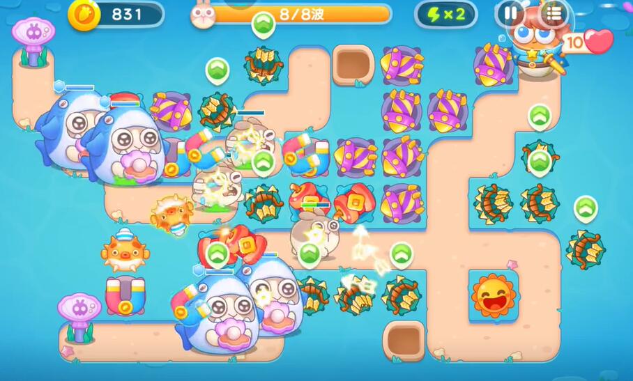 2、在磁铁上方建造一个河豚,利用多重箭塔摧毁掉上方的建筑,建造一个烟花塔进行输出。