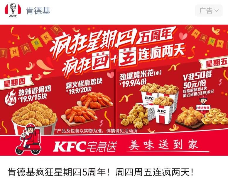 你是不是已经受够了疯狂星期四无孔不入的营销?当其他人玩梗时还没有吃过疯狂星期四的你有没有感觉被排挤?看到结尾是v我50的段子你是不是已经厌烦?v我100,我去吃麦当劳给你出气。