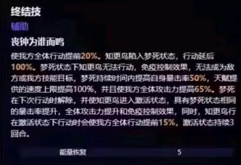 使我方全体的行动提升20%,自身行动延后100%,并且提供全队的攻击力,进入激活阶段还可以提升全队的攻击力和免控的效果,还能够提供全体的行动提前的效果。