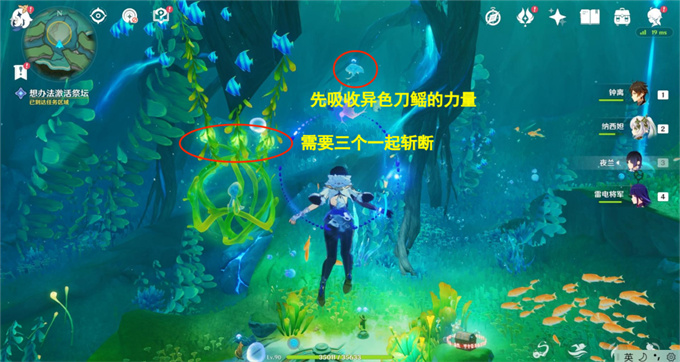 3、然后来到水下找到异色刀鳐吸收能力斩断水草。