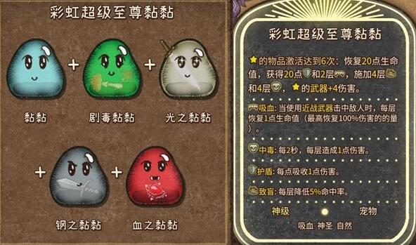 2、彩虹超级至尊黏黏(神级,吸血,神圣,自然,宠物):黏黏+剧毒黏黏+光之黏黏+钢之黏黏+血之黏黏
