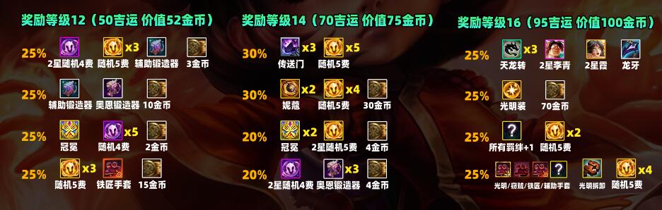 40吉运(价值40金币):奖励:2*成装、4费、5费(30%)、光明装、2*5费、重铸(30%)、6*散件(20%)、妮蔻、4费、12金币(20%)