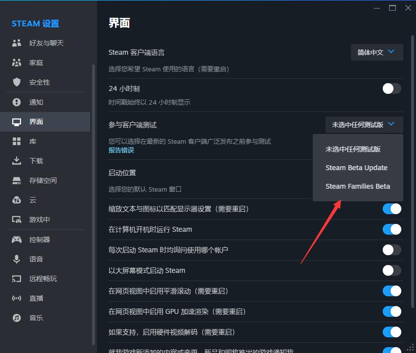 2、在界面中选择参与客户端测试,选择第三个Steam families Beta的版本。