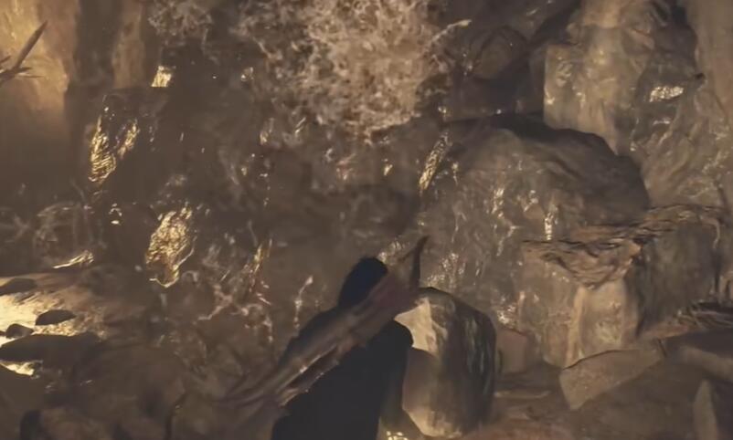 5、沿着水流冲出的通道移动,在来到外面后右转进入右侧的洞穴之中。