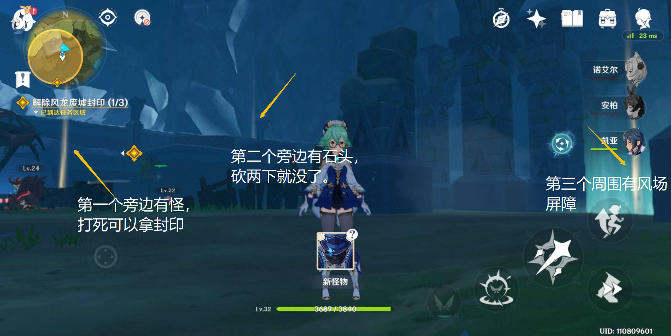 第一个在怪旁边,第二个在石头里,第三个在风屏障里。