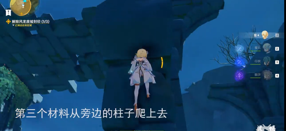 3、走到下图这个位置,借助风场,到任务提示的最右边区域,到了之后先解锁传送锚点,接着去寻找光点。