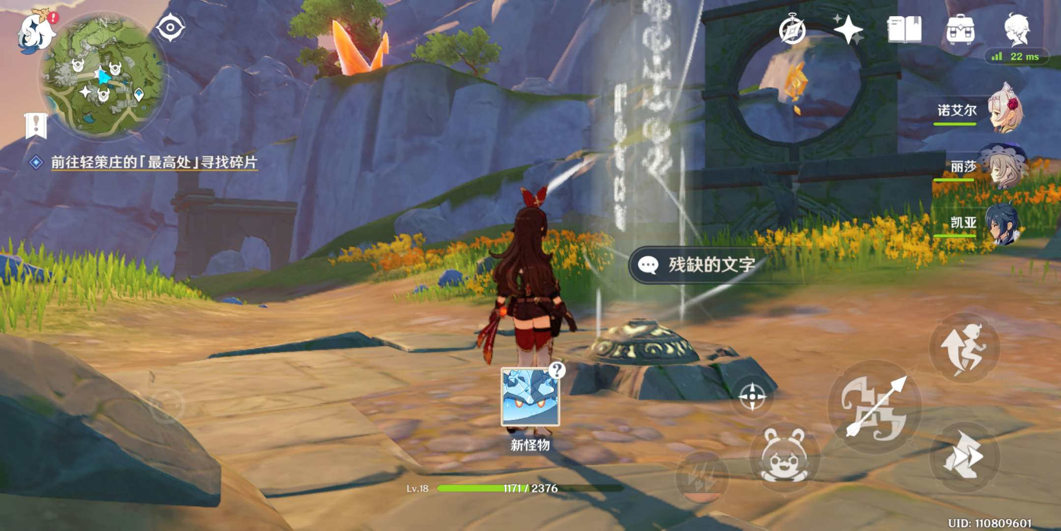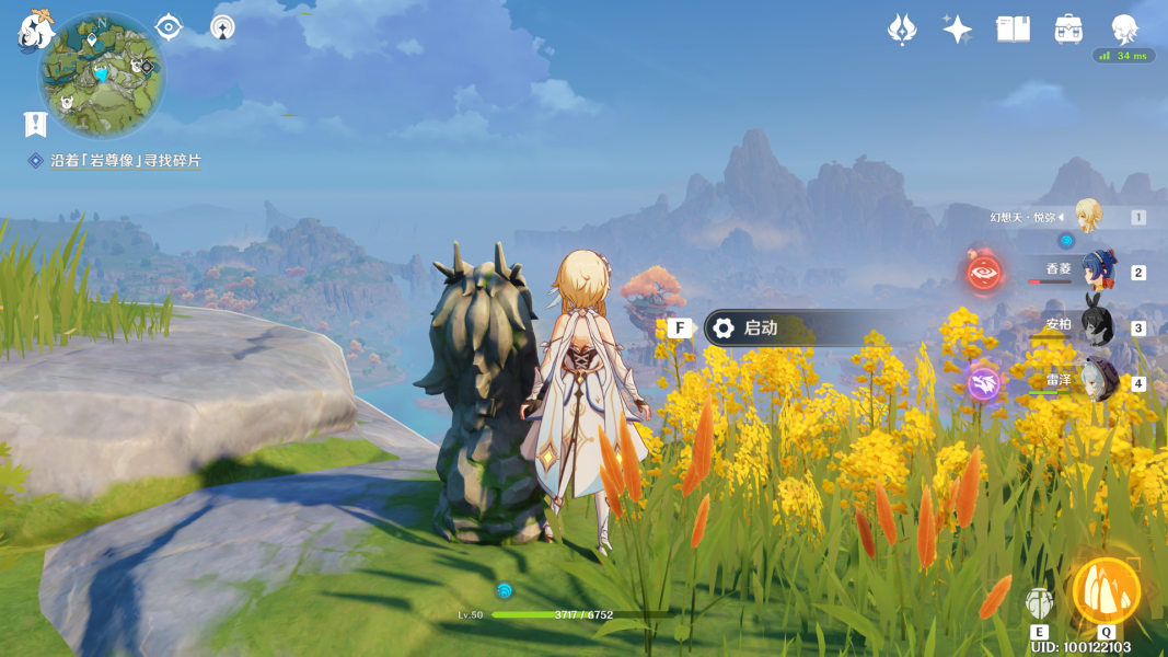 5、对话完之后,传送到轻策庄的传送点,过去与若心奶奶对话,她要求我们沿着岩樽像寻找碎片。