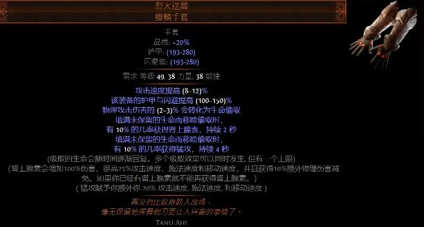 烈火送葬手套带来“常驻”的猛攻和肾上腺素,带来大幅度的移动速度,攻击速度和伤害