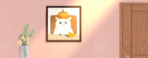 解压泡泡:将泡泡压破之后将桌子上的花放好,最后小猫的照片挂在墙上。