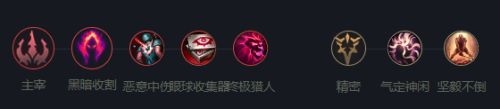4、符文推荐:【主宰 黑暗收割 恶意中伤 眼球收集器 终极猎人 精密 气定神闲 坚毅不倒】