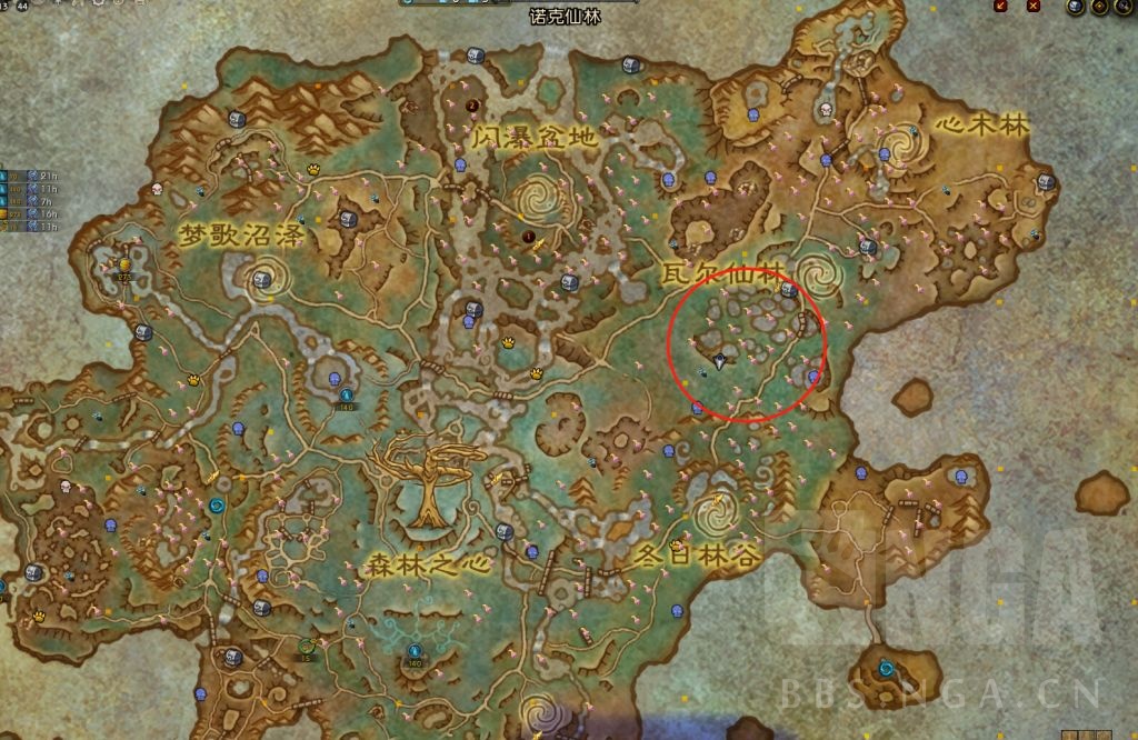 1、下图红圈里面,瓦尔仙灵下面一点,击杀地图上的中立鹿,会掉落很多勇士的皮毛。