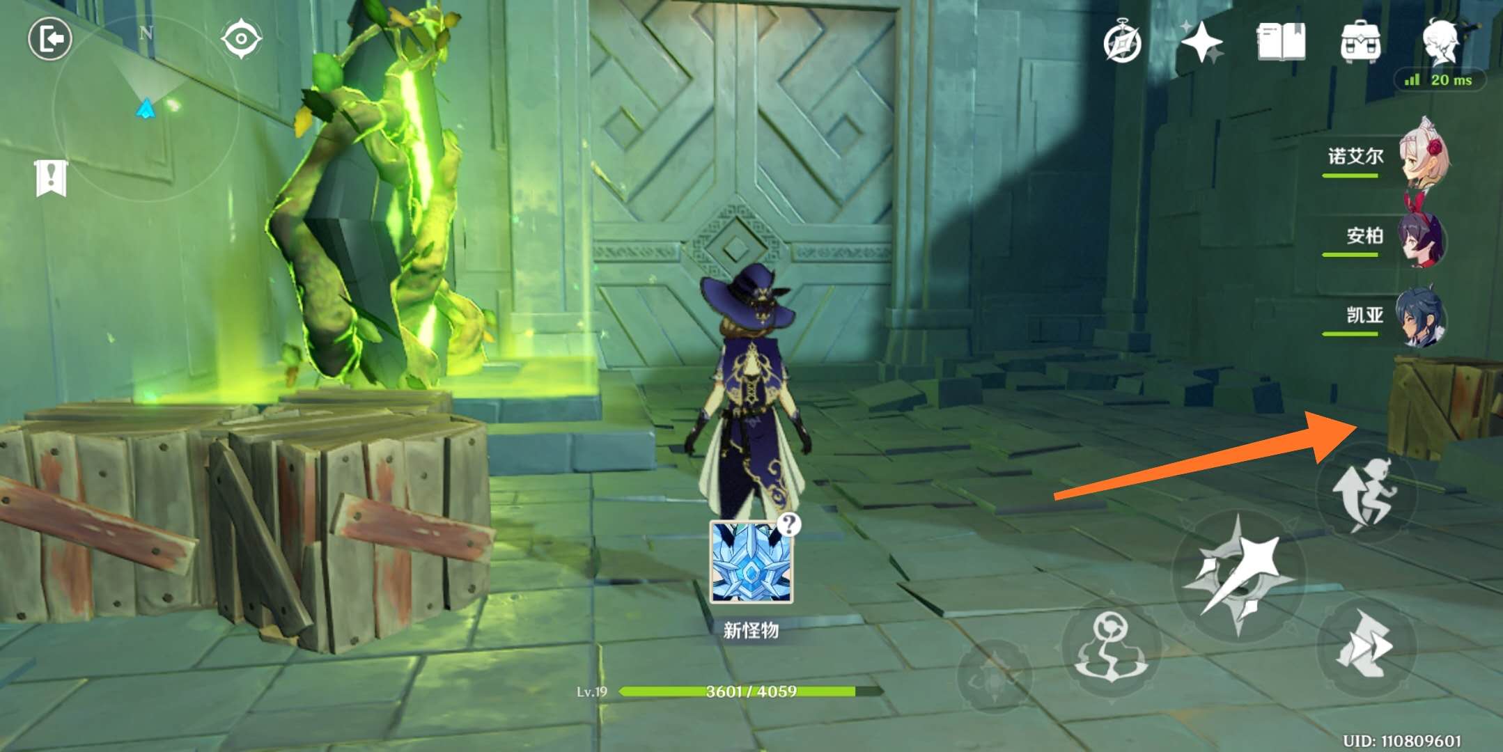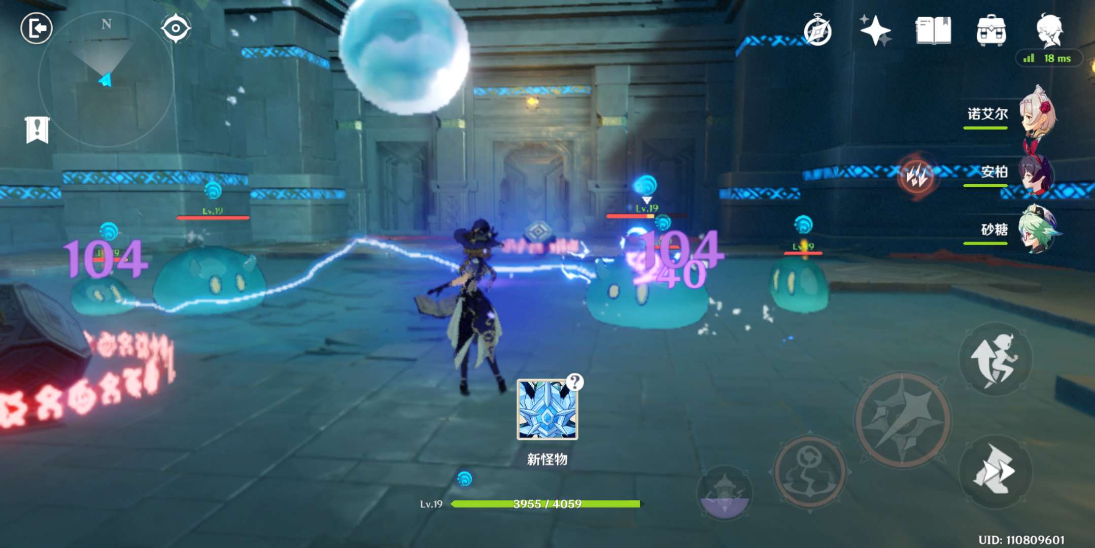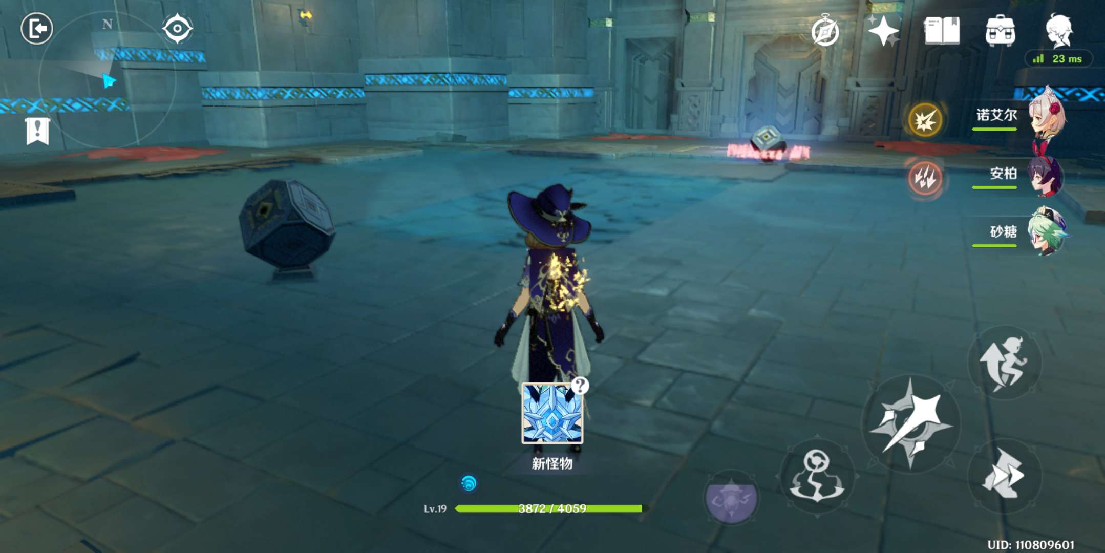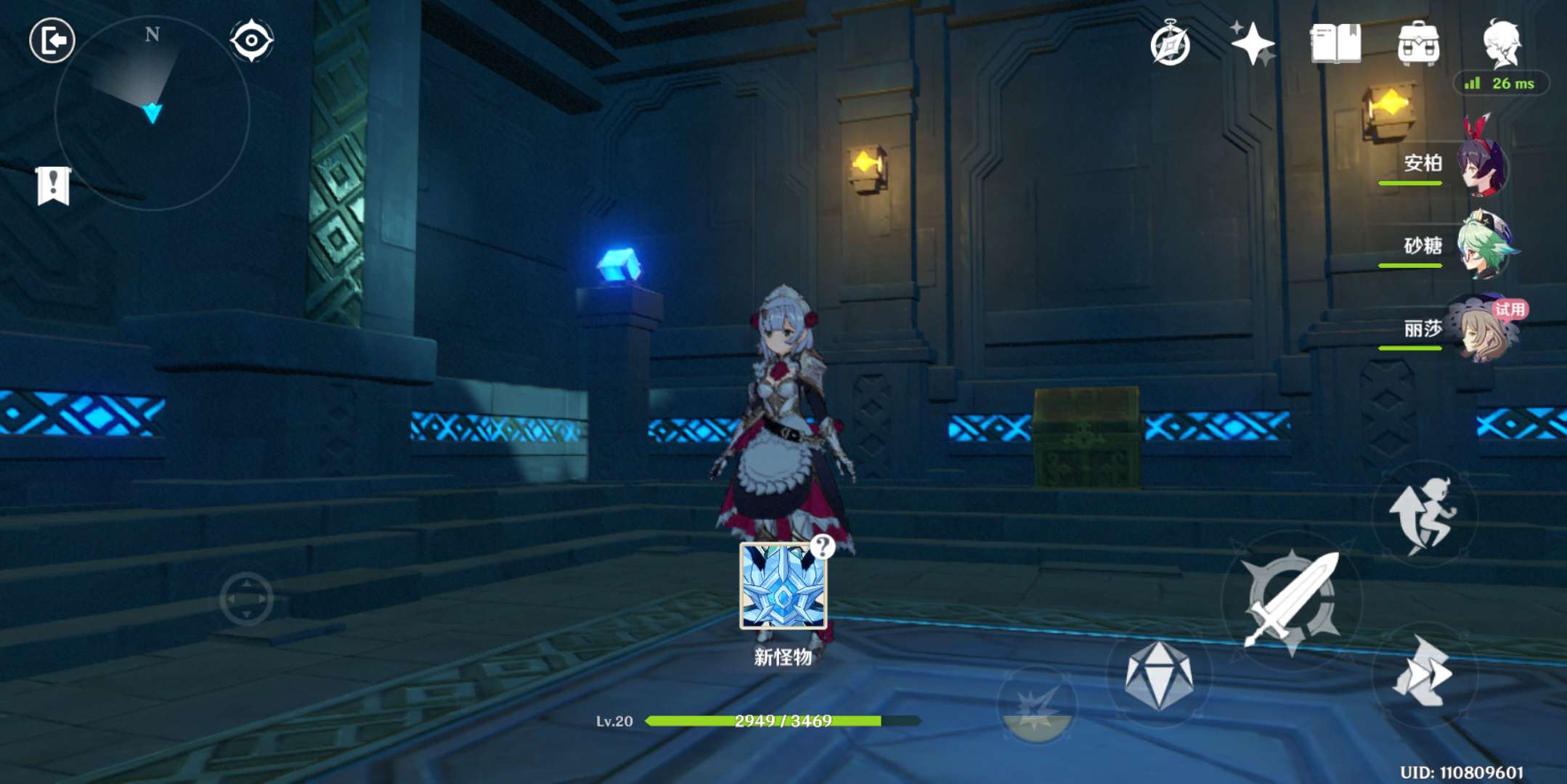 7、杀完这波之后,再按刚才那个机关,会出现一个冰深渊法师,也是限时击杀,这个相对简单一点,用诺艾尔砍掉它的盾或者安柏射掉它的盾,就很简单了,注意躲避,不要让它的冰冻到你。