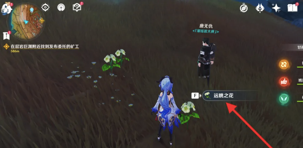 2、可以看见NPC唐无仇,前面有三多清心,其中一朵就是远望之花。(三朵都摘了可以触发支线任务)