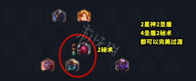 如果开局选秀直接拿个铲子合成圣盾的话,完全可以用4圣盾来过渡了,前期是很定的。