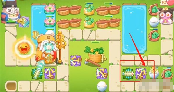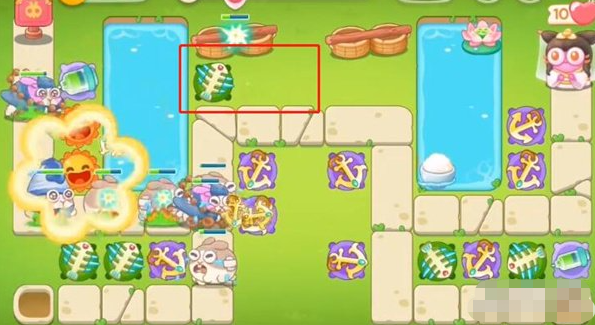 9、第九波左侧建立一个鱼骨头升一级打上面的障碍物,法海兔消灭,进入故事剧情,有金币之后升级满级,障碍物全清理。