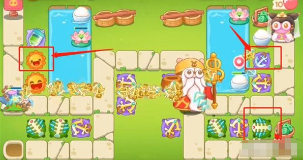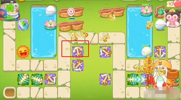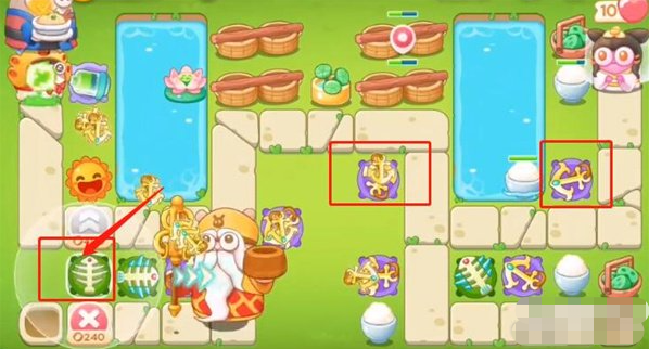 6、第六波右上角增加一个船锚,有金币升满级,中间增加一个船锚升一级,打上面障碍物,左侧加一个鱼骨头。
