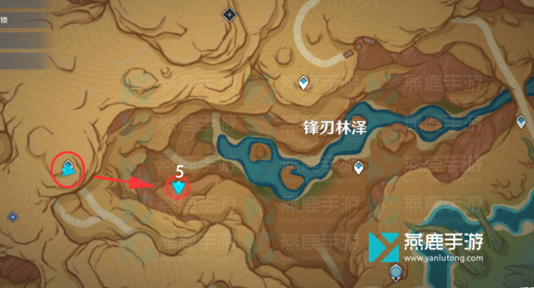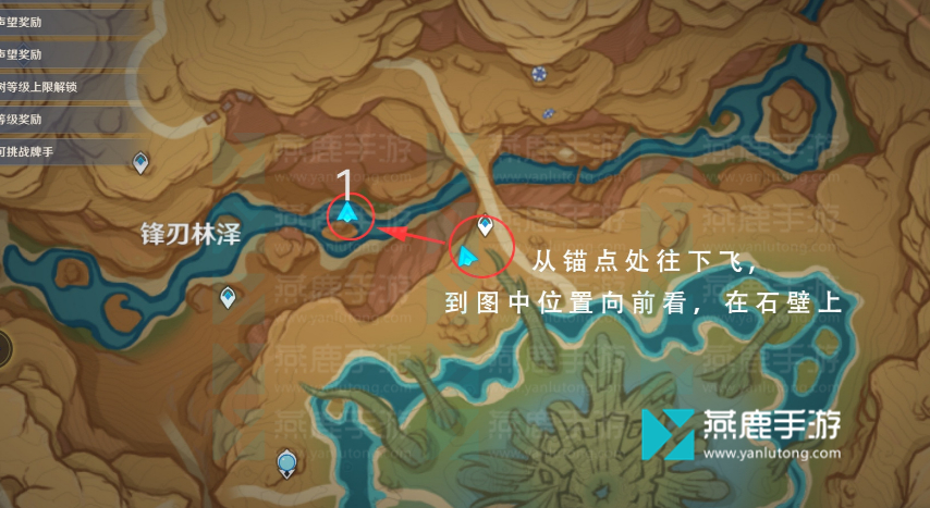 4、忧昙花④。传送锋刃林泽上方锚点,往下飞,到箭头位置回头看,在山壁上。