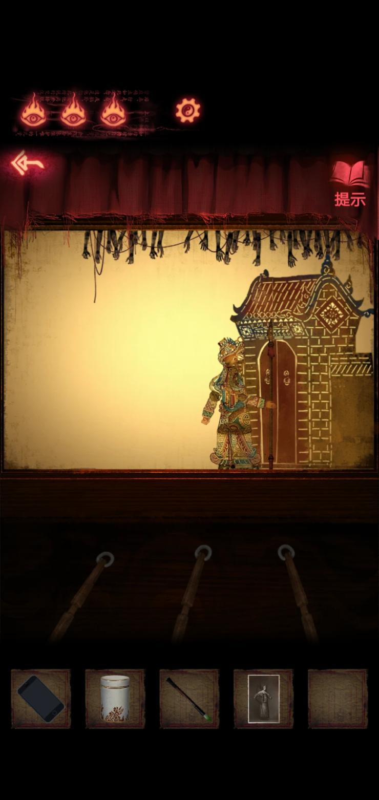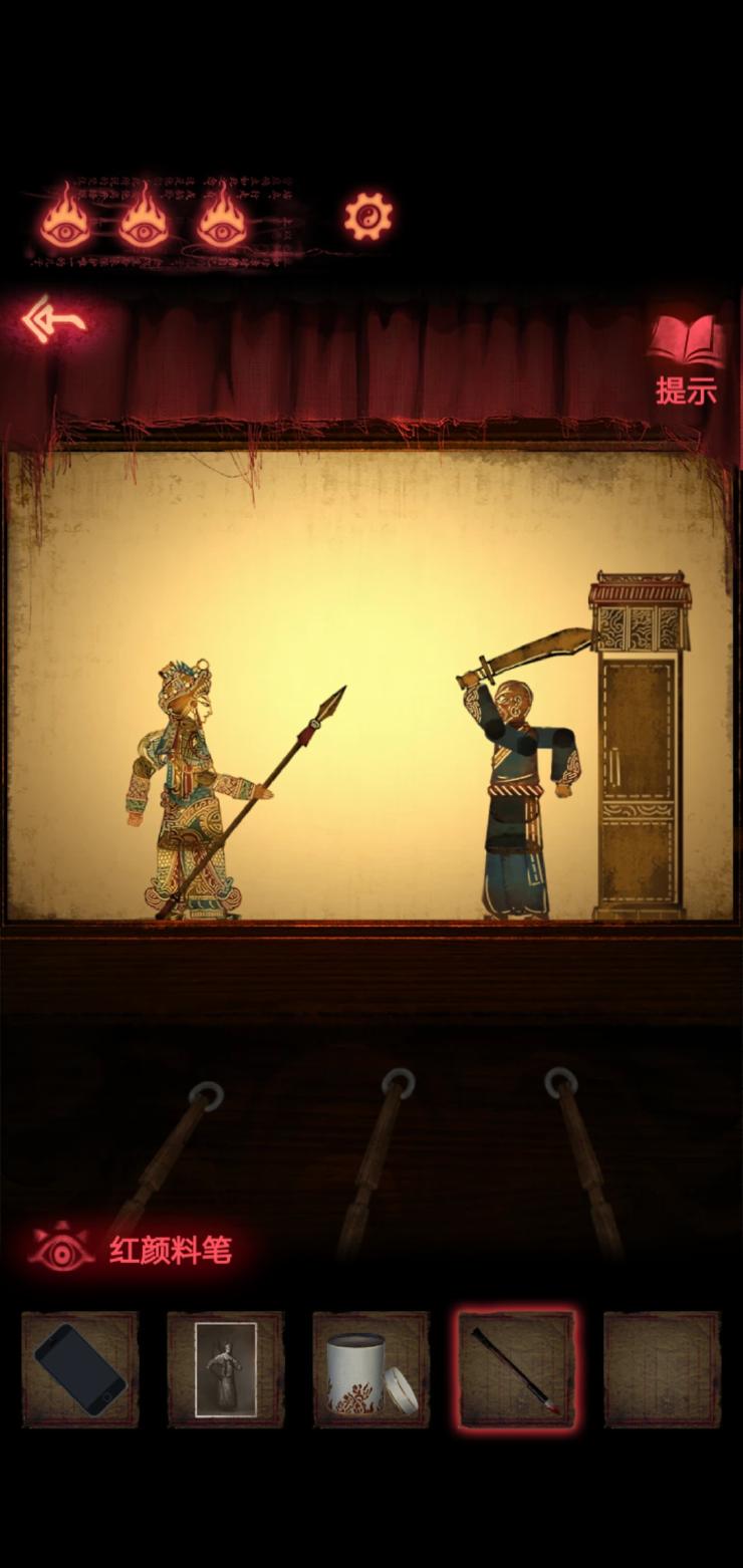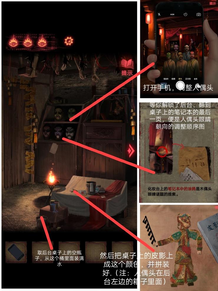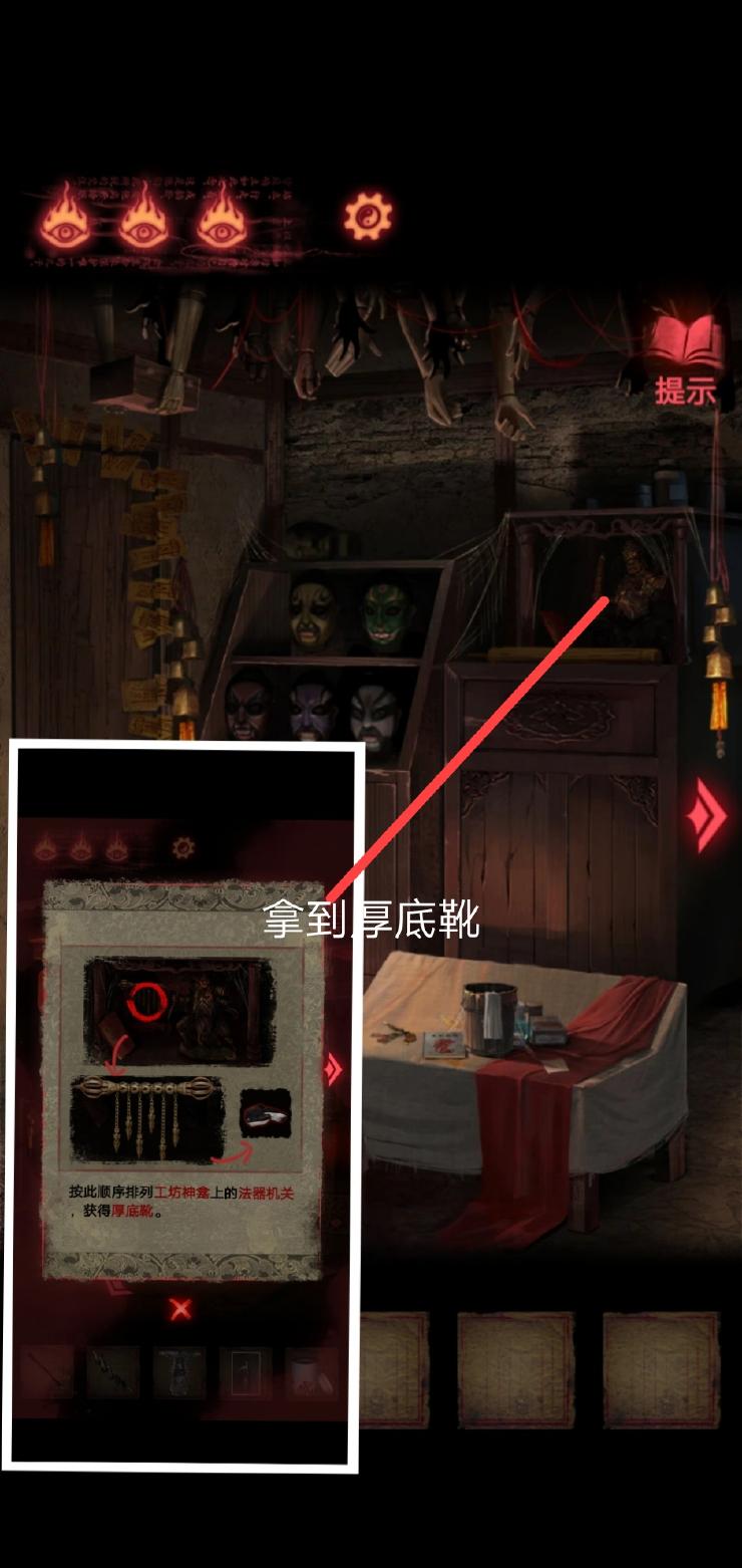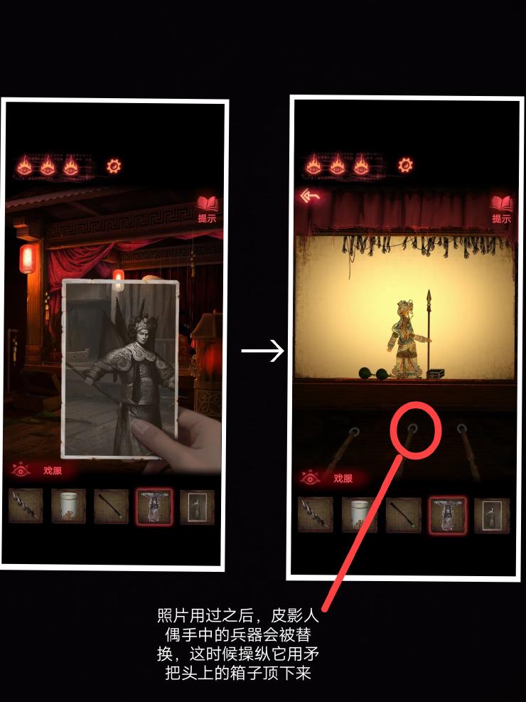 8、然后按照这个密码拿到厚底靴,按照图四:把靴子,马鞭,戏服放在那个位置,解除封印.皮影人偶便可以活动了