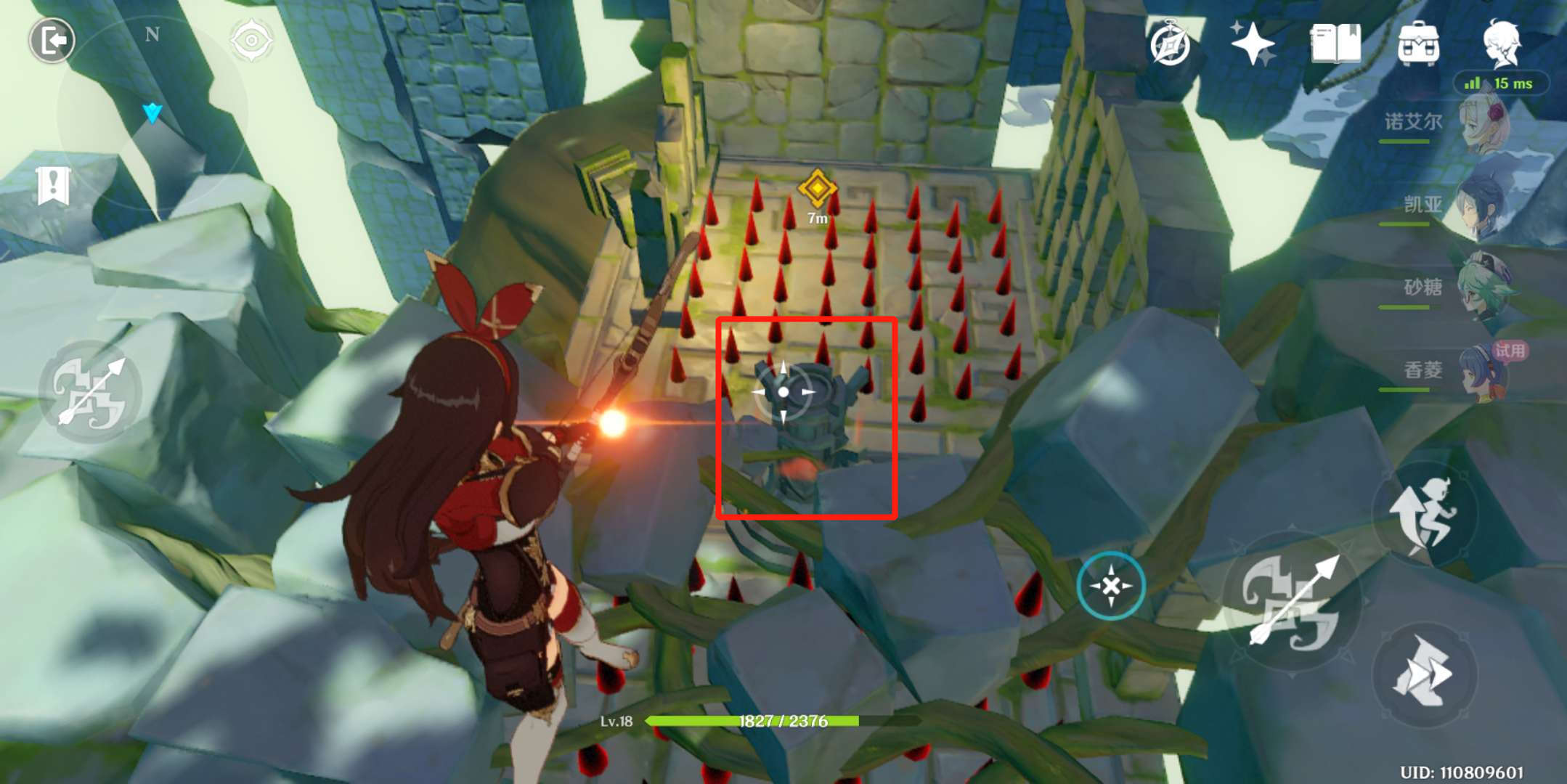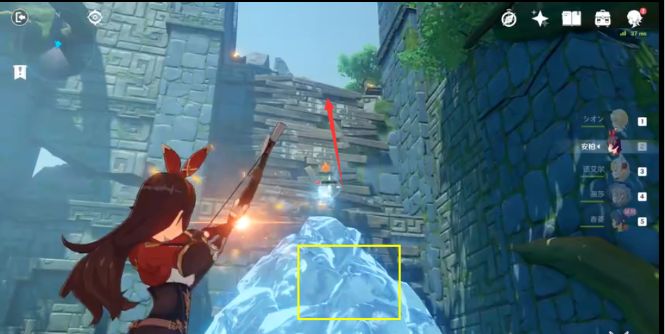 5、走到下图这个地方,箭头指的地方有个元素方碑,用安柏射,然后前面的大门开启了。