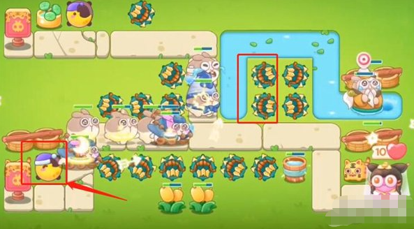 9、第十波左中增加月亮塔满级,障碍物全部清理完毕,具体塔防如下。