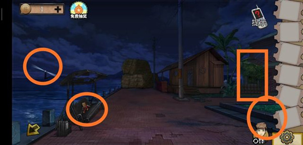 1、首先我们通过点击左下角人偶即可获得望远镜,利用望远镜观察左侧灯塔,灯塔亮的次数和颜色分别是红7绿5蓝3黄,再点击右边草坪拿到半瓶矿泉水。