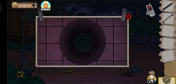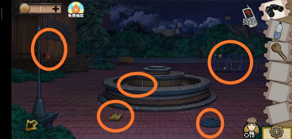 7、最后我们组合竹耙、胶带和棍子获得加长竹耙,回到书包场景,用加长竹耙把栏杆对面玩具钓竿和瓶子勾回来。多点击瓶子打开拿到纸条,获得线索上上下下左右。切换视角再回到女方视角,来到公园喷泉旁看到按钮,输入纸条上的方向,获得一根铁钩,用铁钩打开井盖,我们把望远镜丢进去,就完成第八关了。