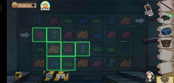 5、我们再正对面墙上谜题按照鸟蛇猫鱼虫顺序,从左箭头连接到右箭头即可。