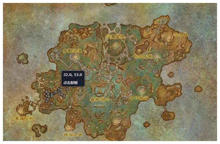 最密集的位置在炽蓝仙野的(32.0,53.0)。