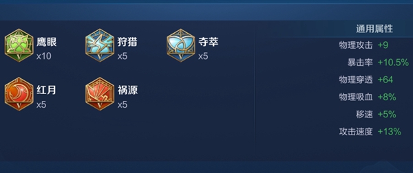 3、第一套铭文:5红月+5祸源、5夺萃+5狩猎、10鹰眼