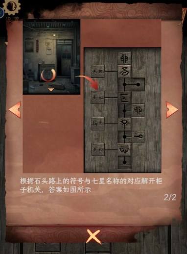 6、点击墙壁上照片对其使用红墨水让照片变得清晰,查看图片上的图案,点击柜子机关盒,再将图案位置调节一致,获得玩具灯。