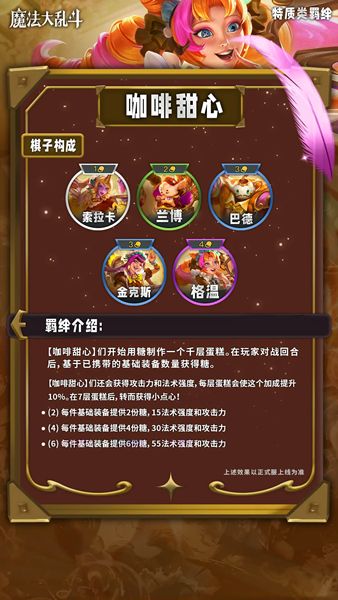 激活羁绊后会在棋盘右下角搭建一个千层蛋糕,同时弈子会获得法强和攻击加成。蛋糕层数越高,属性加成就越高。每次与玩家对战结束后,会根据已有的基础装备,为蛋糕提供一定数量的糖,在叠到7层蛋糕以后,对战结束会获得一些小点心
