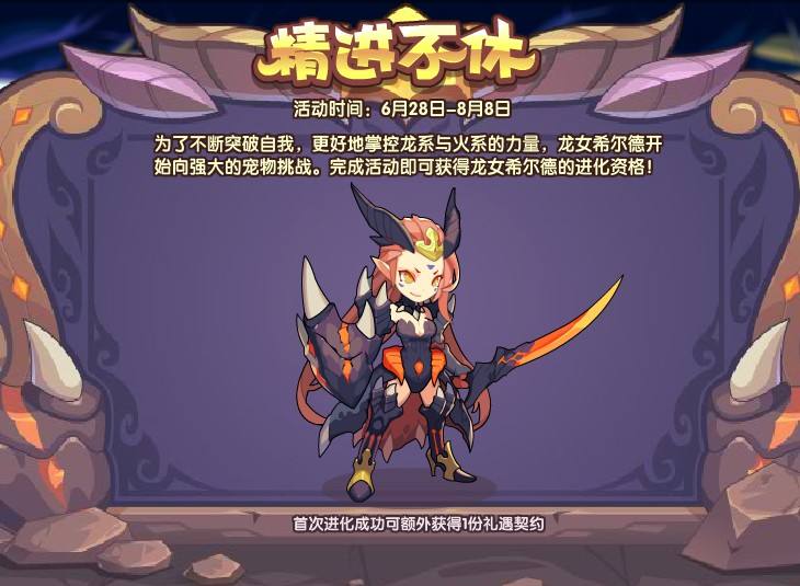 为了不断突破自我,更好地掌控龙系与火系的力量,龙女希尔德开始向强大的宠物挑战。完成活动即可获得龙女希尔德的进化资格!
