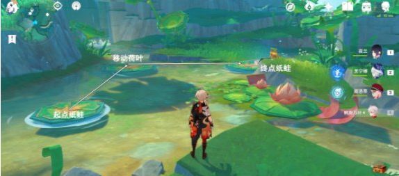 靠近终点纸蛙就会出现起点纸蛙,操作纸蛙通过移动荷叶至终点即可完成解谜。