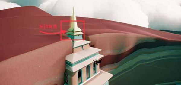 3、然后玩家接着飞往神庙塔顶后面的位置处,即下图红色方框圈住的地方。