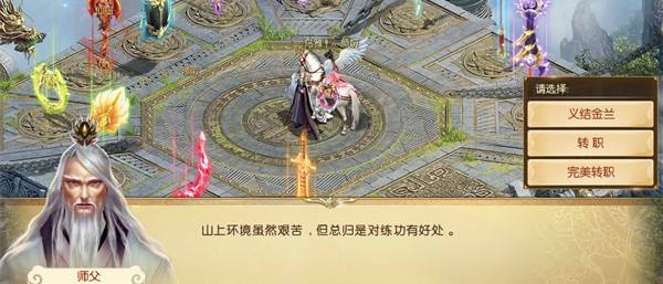 3、与师傅对话,点击申请“转职”,达到50级之后即可变更自身职业,玩家首次转职免费,之后每次转职需要消费50两金子,转职成功后将继承原职业的技能等级,符石天赋和外观时装,自动卸下原职业所有装备,请保证背包空间足够。