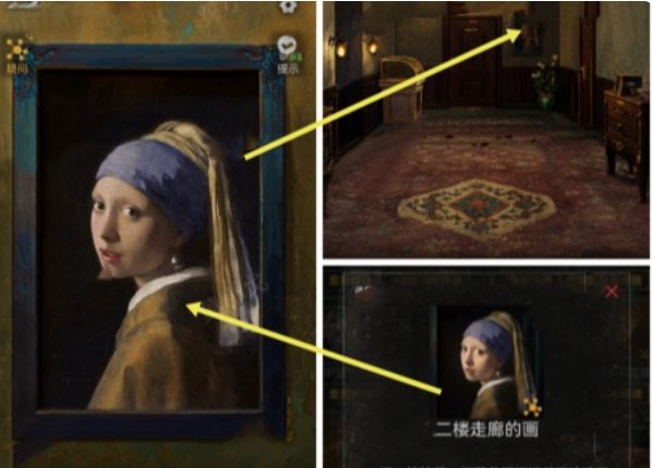 10、点击墙上的画观察画框的颜色及人物眼睛朝向蓝下,得到线索二楼走廊的画。