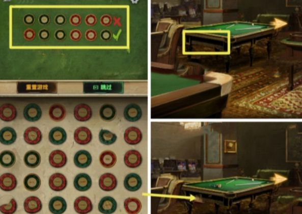 13、会所一楼台球厅左点击墙上的骰子装饰,得到线索金骰子装饰观察骰子的颜色及点数金-六。