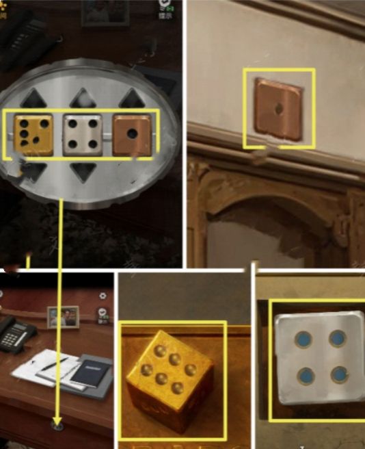 3、点击桌子的抽屉,根据三个场景骰子装饰的颜色及上面的点数,解开密码锁金-6、银-4、铜-1。