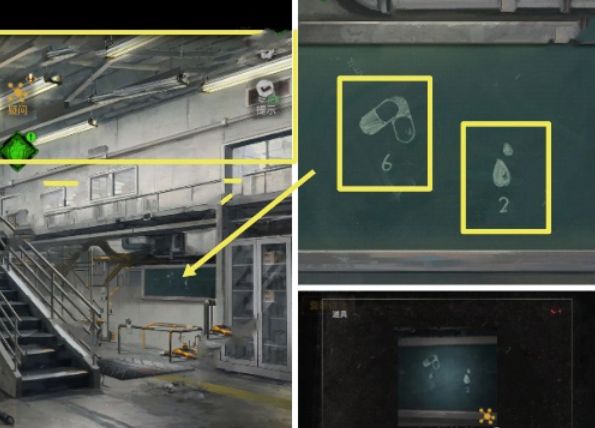 4、点击黑板,得到线索黑板上的符号,水滴-2、药丸-6,观察天花板上完好的灯泡的数量-4。
