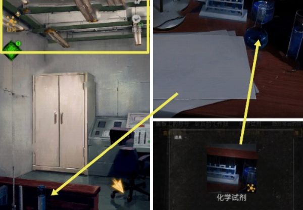 8、点击桌子上的化学试剂,得到线索化学试剂,观察天花板上完好的灯泡的数量-2。