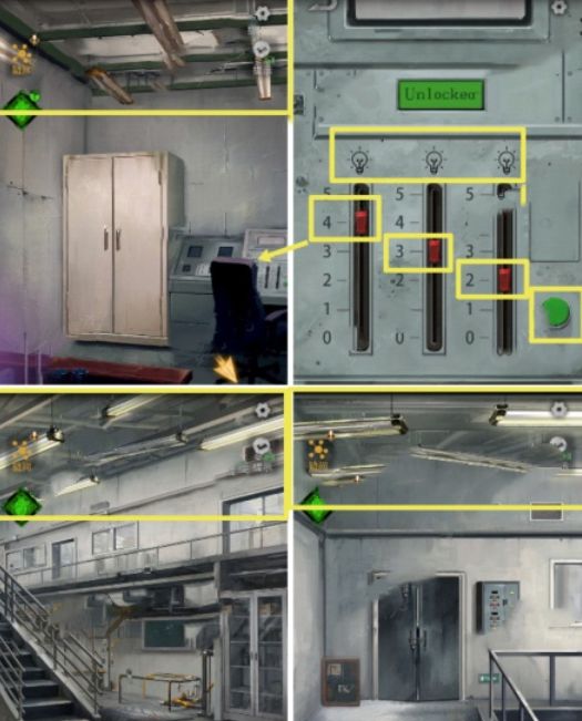 14、点击装置上的密码锁,根据黑板上的图案和数字、二楼桌子上的图案和数字,调整正确的图案叶子、水滴、风扇、火、试管、药丸,启动装置,得到线索违禁药品生产线。